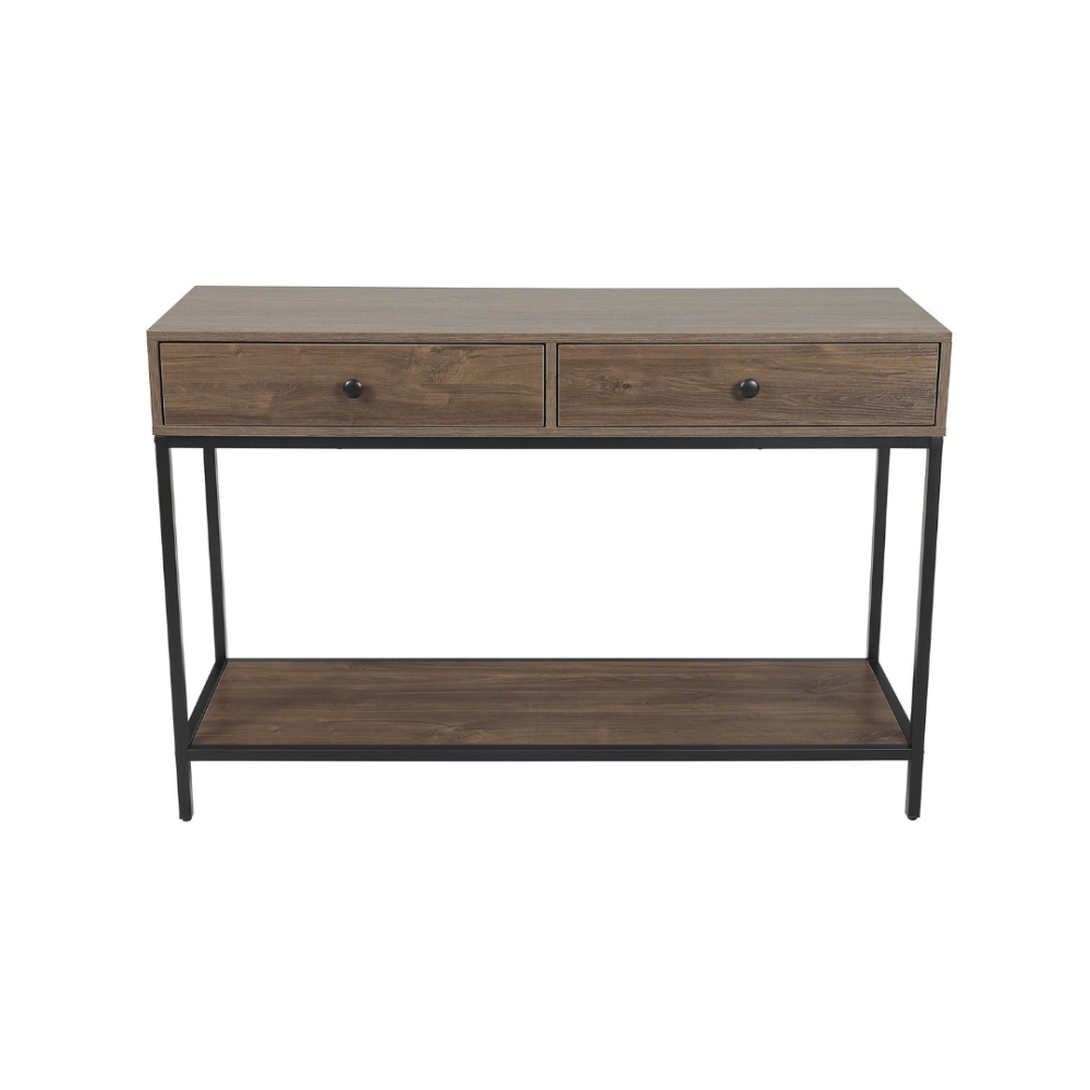 - تتميز الطاولة بتصميمها الأنيق والبسيط، حيث تتكون من سطح خشبي بني وقاعدة حديد سوداء مقسمة إلى دورين.