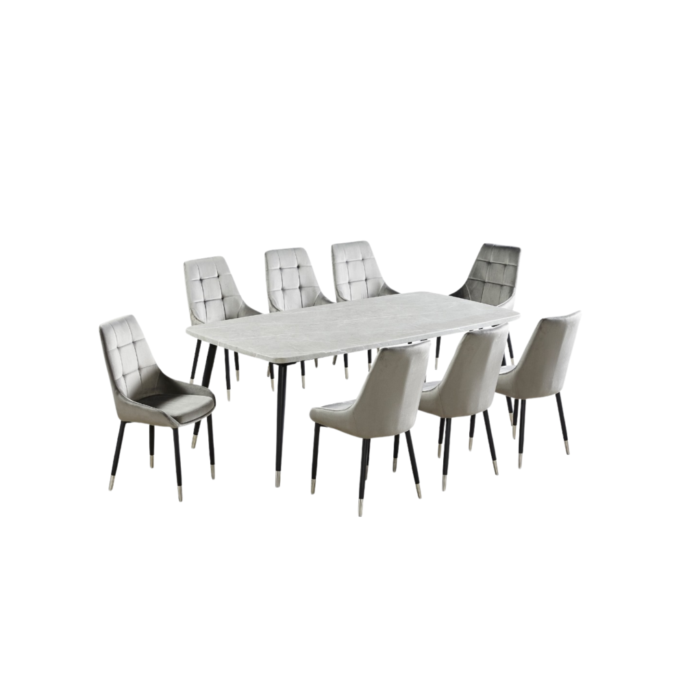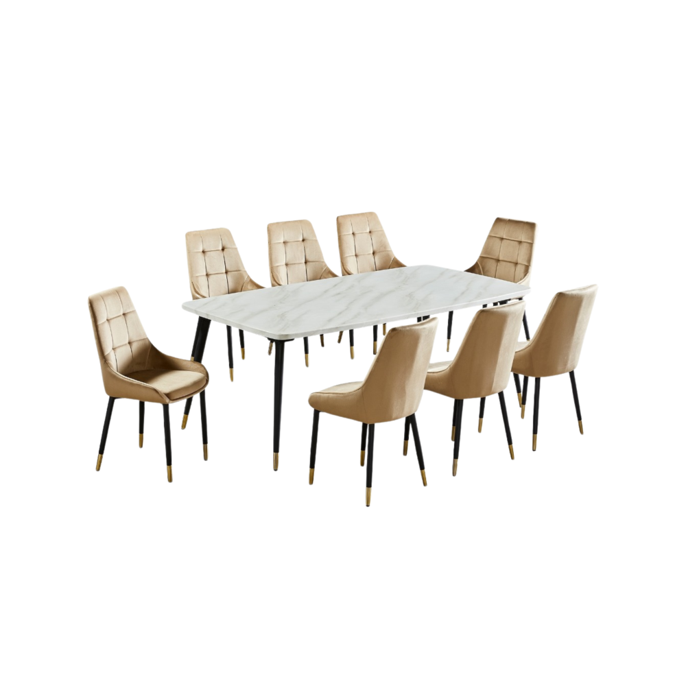 عززي من أناقة قطع الأثاث في منزلكِ باقتناء هذا الطقم الرائع، باللون الابيض(اوف وايت) مكون من طاولة سفرة و 8 كراسي دون مساند ذراعين وتنجيد فاخر، ابعاد الطاولة 200 سم× 100 سم ومصنوع من خامات عالية الجودة لضمان الاستدامة.