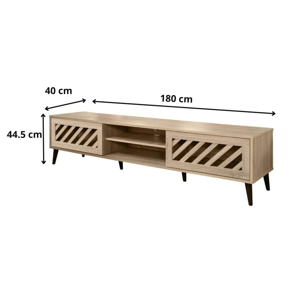 يمكن لهذه الوحدة المصنوعة من الخشب المصمم هندسيًا أن تستوعب شاشات تلفزيون صغيرة إلى كبيرة الحجم.